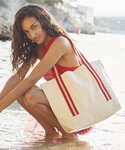 Contains 100% certified organic cotton. Premium, heavyweight fabric. Soft cotton, striped webbing handles. Can be carried by hand or over the shoulder.