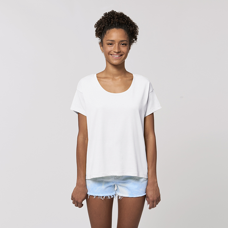80% LENZING™ ECOVERO™, 20% organic Cotton. Single Jersey. Ribbed collar. Taped neck. Side seams – non tubular body. Twin-needle detail at hem and sleeve. Set-in sleeves. Wide crew neck. Crop length with dropped back. Size label only for easy rebranding.