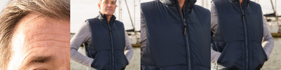 Slightly padded deep collar, channel quilted outer, deep cut arm hole for added comfort. Concealed mobile phone pocket with velcro fastening, fashionable shaped drop back. Deep cut patch pockets, inside chest pocket. Result zip pull. Concealed access for print and embroidery.