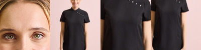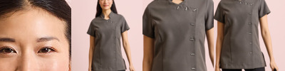Beauty and Spa tunic with Mandarin collar. Side yoke detail with 4 feature buttons and satin trim. Princess seams and bust darts for flattering fit. Side vents. Back zip fastening. Satin piping to collar edge. Short sleeves. Easycare. Size 8, 10, 12, 14,16, 18, 20, 22, 24