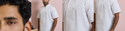 Ideal for laundry. No buttons to fall away. Soft hand feel. Specifically engineered for user comfort. Mandarin Collar stand with topstitching. Press studs. Unisex styling. 60 degree domestic wash.