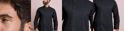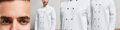 Long sleeve chef’s jacket. Superior overall comfort. Soft hand feel. Mandarin Collar stand with topstitching. Removable studs. Unisex styling. Comes with black studs (other colours available see PR652) 60 degrees domestic wash. 10 hole wrap over fastening. Turn back split cuff.