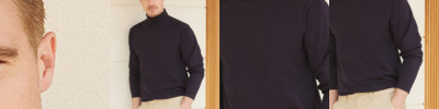 Cotton rich with double thickness rib roll neck. Reinforced shoulders and neck. Twin needle stitching. Hemmed cuffs.