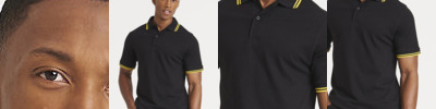 Contrasting tipping on collar and cuffs. 2-button placket with dyed-to-match buttons. Size tab label. Spare button. Cuffed sleeves. 1x1 ribbed flat collar and cuffs. Stylish and modern fit. Taped neck. Twin-needle stitching on sleeves and hem. Short sleeves. Size label only, for easy re-branding - colour coded black for Unisex. Excellent surface for print and embroidery.
